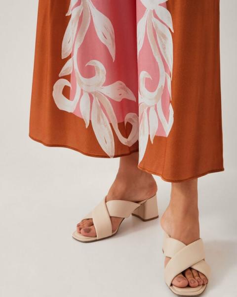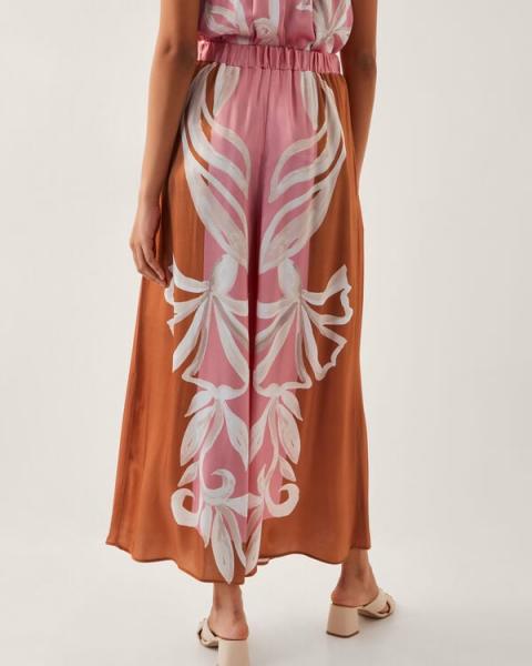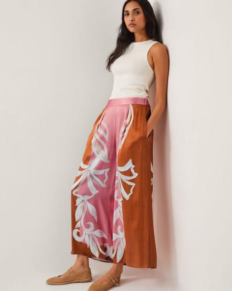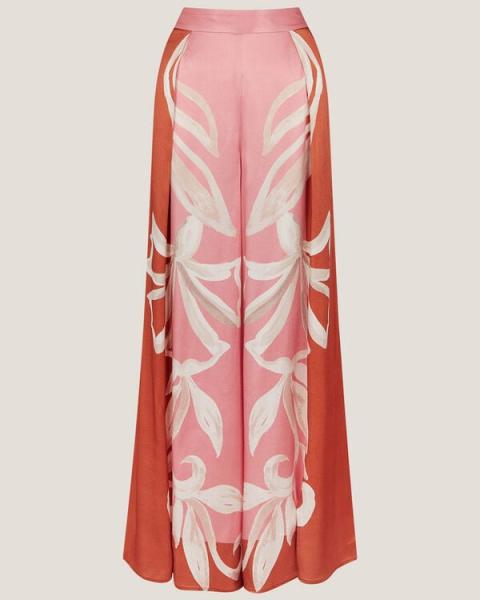 Widely received. A chic pair to show off in summertime, these trousers are made from a silky satin fabric in dusty pink and terracotta tones, whilst the ornate floral motifs decorate the wide-leg cut. Matching top available. Pink