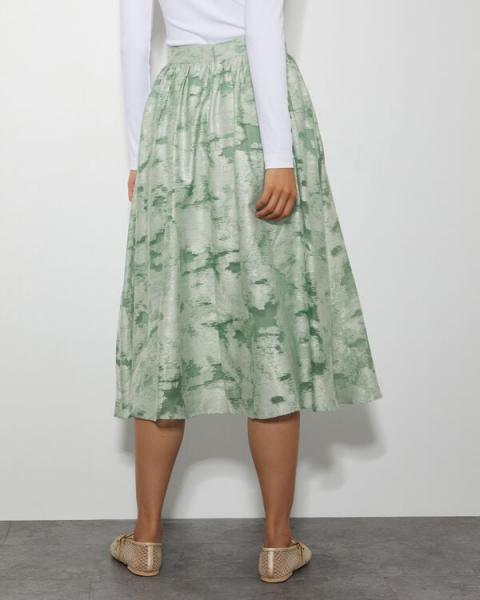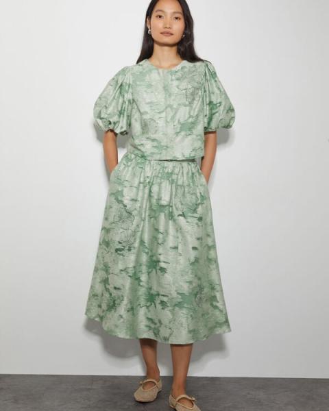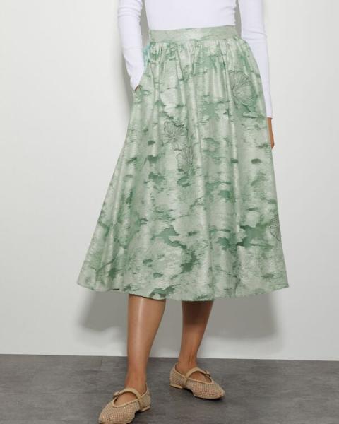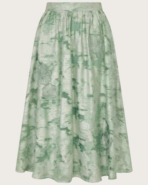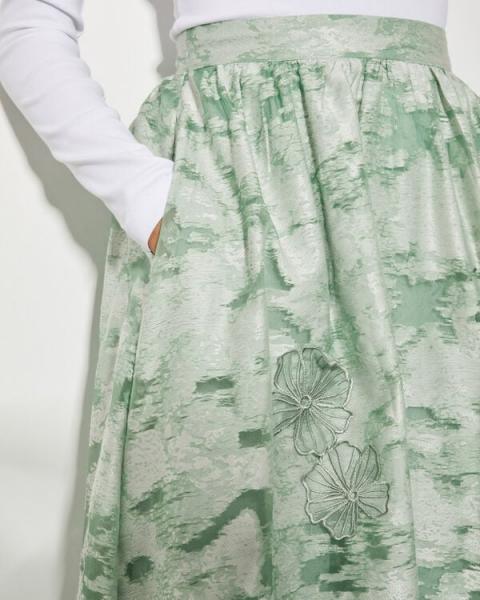 Swishy statement. Showcasing a dreamy green jacquard fabric, this midi skirt is cut to an A-line shape and decorated with embroidered flower embellishments. Make it a match with the Josie Puff Sleeve Floral Jacquard Top. Green